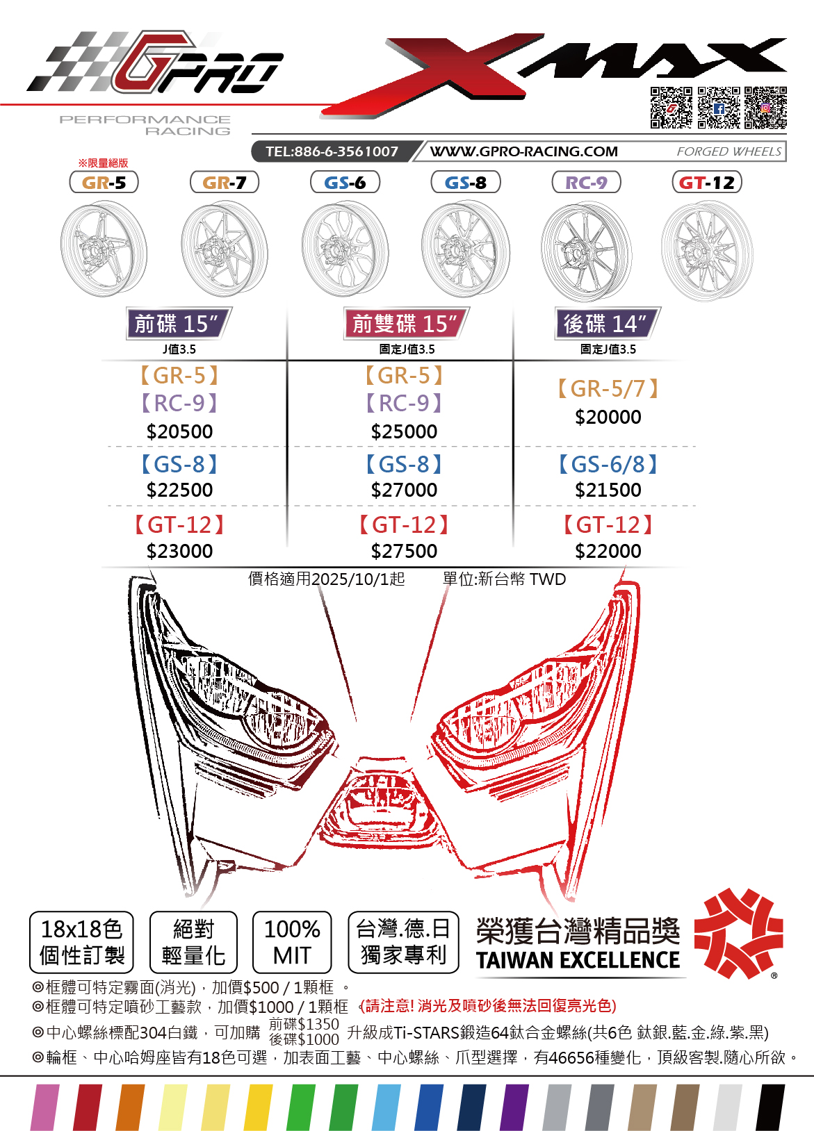 輪框&哈姆顏色:紅 / 橘 / 深金 / 淺金 / 香檳金 / 綠 / 青蘋綠 / 深藍 / 淺藍 / 普魯士藍 / 紫 / 粉紅 / 深鈦 / 淺鈦 / 深灰 / 淺灰 / 黑 / 銀